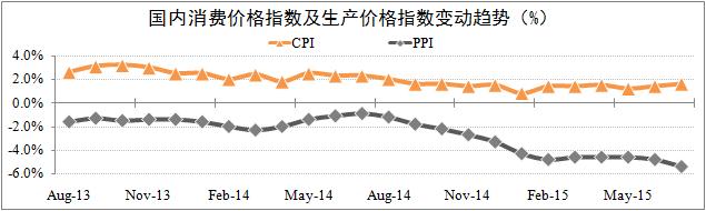 通貨緊縮預期增強。截至7月份,國內價格總水平運行依然偏弱,以消費價格指數(CPI)和生產價格指數(PPI)為主的經濟面出現“剪刀差”現象。數據顯示,7月份CPI環比上漲0.3%,同比上漲1.6%;PPI環比下降0.7%,同比下降5.4%。其中PPI已連續41個月出現負增長,且幅度逐月擴大。CPI與PPI增幅差距的進一步擴大強化了國內通貨緊縮預期,宏觀經濟增長風險加大。