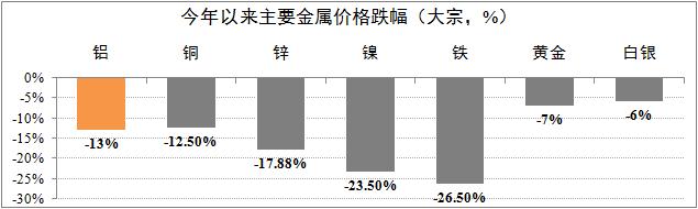 大宗商品價格走低。今年以來,全球大宗商品價格出現顯著下跌現象,并引起近期大宗商品的拋售潮。有色金屬全線潰退,其中,鋁價下跌13%、銅價下跌12.5%。大宗商品價格走低暗示著全球經濟增長動能相對缺失,綜合分析成因,主要包括以下三點:一是大宗商品總體處于供過于求的狀態;二是美元走強,9月份加息預期增強;三是新興市場經濟體增長疲軟。