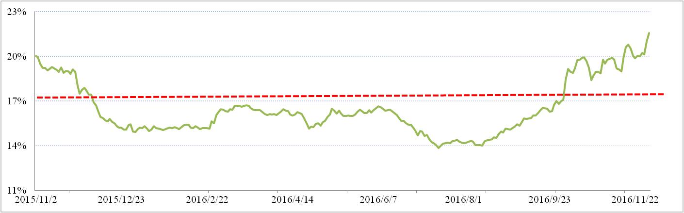 滬鋁三月比例價(jià)方面,11月滬鋁三月合約下行趨勢明顯,月末加權(quán)平均價(jià)報(bào)收于13,118元/噸。若按17.6%氧化鋁作價(jià)比例,2017年1月份全國氧化鋁長單加權(quán)價(jià)格為2,309元/噸,與現(xiàn)貨加權(quán)價(jià)格的價(jià)差擴(kuò)大到646元/噸。12月份期鋁全國氧化鋁現(xiàn)貨加權(quán)價(jià)與滬鋁三月加權(quán)平均價(jià)實(shí)際折算比例為22.95%。