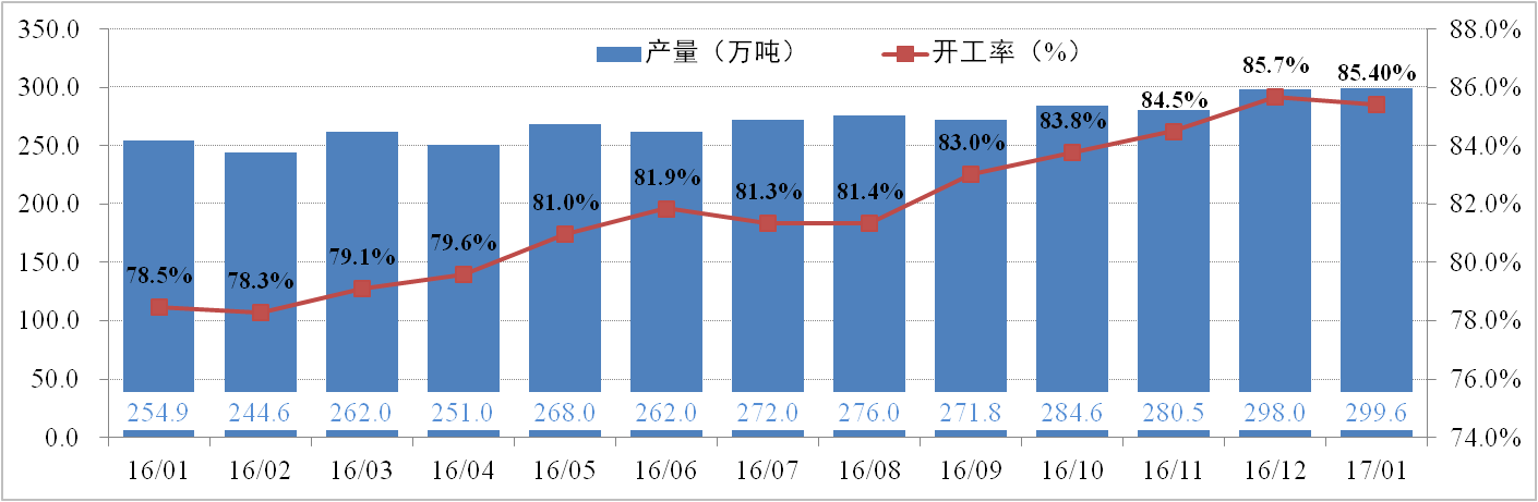 供給方面:2月10日,全國電解鋁有效產(chǎn)能為4,226.6萬噸,運(yùn)行產(chǎn)能37萬37.5噸,開工率為88.42%。其中,1月份電解鋁總產(chǎn)量為299.6萬噸,供應(yīng)持續(xù)增加。調(diào)研數(shù)據(jù)顯示,2017年電解鋁新產(chǎn)能已投產(chǎn)98.1萬噸,預(yù)計(jì)年度最終實(shí)現(xiàn)588.5萬噸;電解鋁復(fù)產(chǎn)21.2萬噸,預(yù)計(jì)年內(nèi)最終實(shí)現(xiàn)152萬噸。
