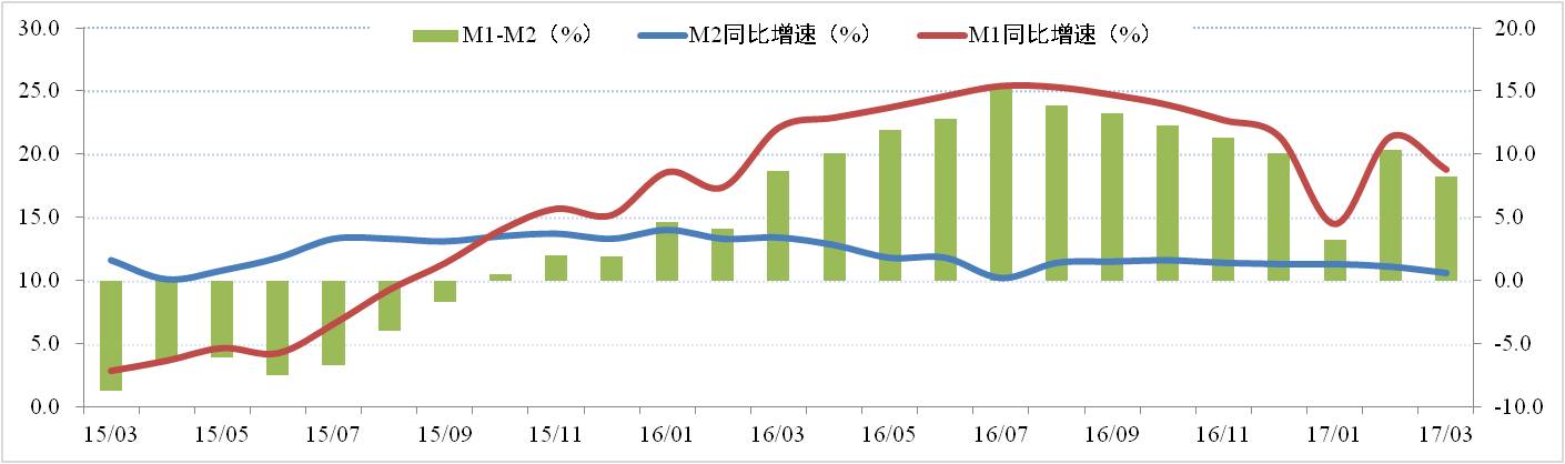2017年2月廣義貨幣(M2)余額159.96萬億元,同比增長10.6%,增速分別比上月末和去年同期低0.5個和2.8個百分點;狹義貨幣(M1)余額48.88萬億元,同比增長18.8%,增速分別比上月末和去年同期高2.6個和3.3個百分點。