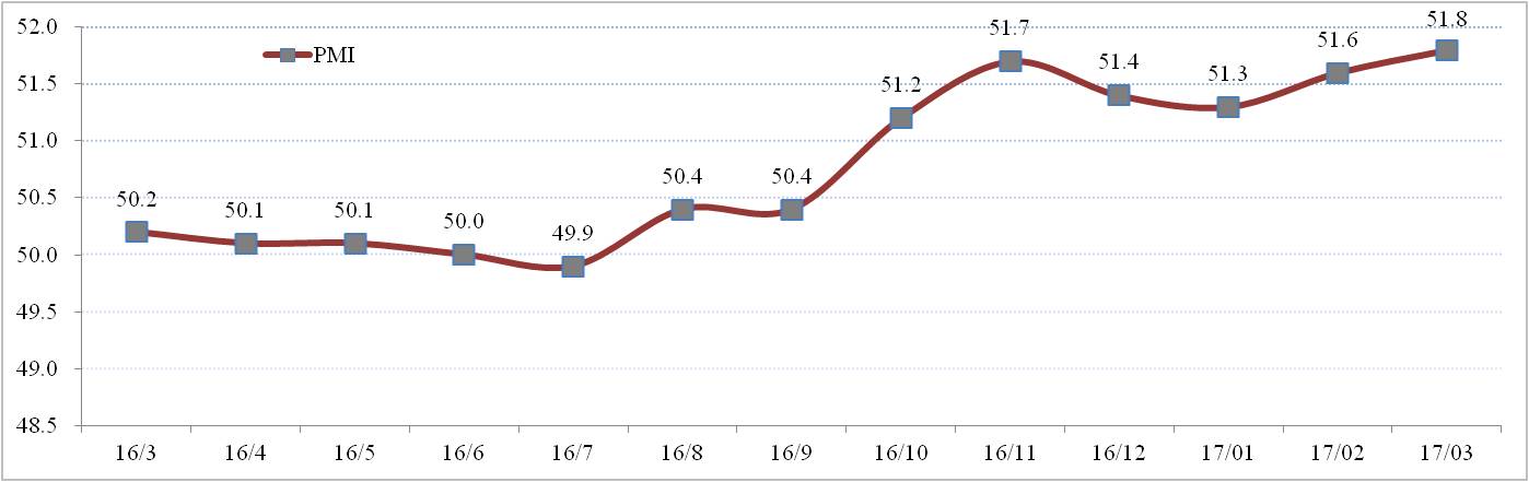 國家統(tǒng)計局數(shù)據(jù)顯示,2017年3月份制造業(yè)采購經(jīng)理指數(shù)PMI為51.8%,連續(xù)兩月上升。其中,生產(chǎn)指數(shù)和新訂單指數(shù)為54.2%和53.3%,分別比上月上升0.5和0.3個百分點。在生產(chǎn)和需求增速回暖的同時企業(yè)采購力度加大,采購量指數(shù)為53.4%,高于上月2.0個百分點。