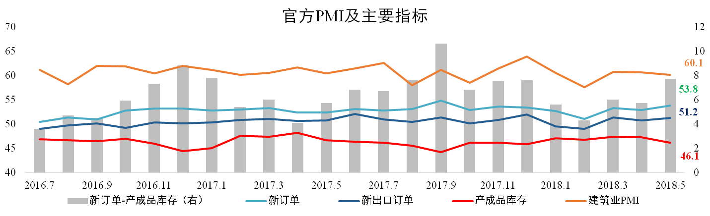 發(fā)稿時間:2018-06-225月份產成品庫存為46.1點,較4月下降0.9個百分點;新訂單為53.8點,較上月上升0.5個百分點,其中新出口訂單為51.2,較上月上升0.5個百分點。建筑業(yè)PMI延續(xù)下滑走勢,較4月下滑0.5個百分點至60.1點。