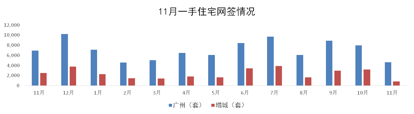 11月,廣州一手住宅網簽量成交4,657套,環比下跌42%。其中增城市場11月一手住宅網簽成交863套,環比下跌73%,成交面積為9.11萬m² 。