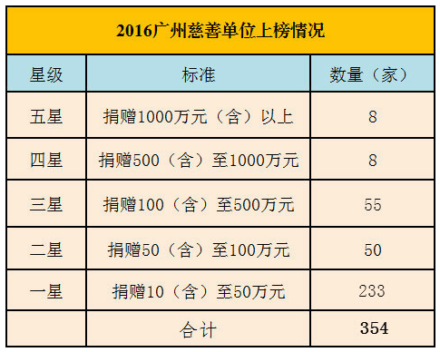 據了解,首屆廣州慈善單位上榜354家,其中五星(捐贈1000萬元以上)8家,四星(捐贈500至1000萬元)8家,三星(捐贈100至500萬元)55家,二星(捐贈50至100萬元)50家,一星(捐贈10至50萬元)233家。