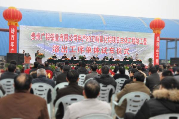 2011年12月28日已經進入冬至時節,但在我們貴州廣鋁氧化鋁項目現場似乎看不到一絲寒意。這里處處是彩旗飄揚、鑼鼓喧天,一片繁忙的景象。省、市各級領導、各界來賓和設計單位、監理單位、施工單位的有關領導都熱情相聚在這里,來共同見證本項目繼2009年6月8日舉行隆重開工典禮以來的又一個重要的里程碑——貴州廣鋁清鎮市年產80萬噸氧化鋁項目主體工程竣工暨溶出工序單體試車儀式。